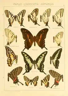 This insect is similar to Iphiclides podalirius, but the cell of the forewing is traversed by one more band, and the band situated on the cross-veins is not continued to the hind angle as in I. podalirius. On the hindwing the black portion of the anal ocellus is reduced to a minute line, while the yellow colour forms a large spot.