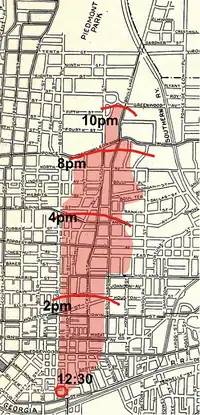 The Great Atlanta Fire of 1917 began just after noon on 21 May 1917 in the Old Fourth Ward of Atlanta, Georgia.[1] It is unclear just how the fire started, but it was fueled by hot temperatures and strong winds which propelled the fire.[1] The fire, which burned for nearly 10 hours, destroyed 300 acres (120 ha) and 1,900 structures displacing over 10,000 people. Damages were estimated at $5 million, ($100 million in 2024).[1]