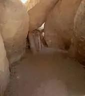 The entrance was marked by a large menhir, decorated with dimples, which is now lying on the ground.[2][1]