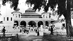 The Great Mosque of Malang was established in 1890 on the land of the Goepernemen or state owned land of around 3,000 square meters. According to the existing inscriptions, the mosque was built in two stages. The first stage began in 1890, then the second stage began on 15 March 1903, and was completed on 13 September 1903. The building is a square-shaped steel structure with tajug roof on top, and although until now the original building is still maintained, the serambi (front porch) of the building was heavily altered, concealing the original architecture of the mosque just behind it.[1]