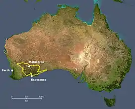 The Great Western Woodlands is located in the southwest of Australia. The woodlands cover almost 16,000,000 hectares (40,000,000 acres), a region larger in size than England and Wales. The boundary of the Great Western Woodlands runs from the Nullarbor Plain in the east to the Western Australian Wheatbelt in the west; from north of Esperance through to the inland mulga country and deserts that are found north of Kalgoorlie.[1]