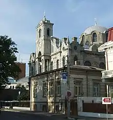 In 1863, the local Greek community decided to build a church, with services in Greek. It would serve both the Greek inhabitants of the city and the Greeks who arrived from abroad in the Port of Brăila. The architect was Avraam Ioanidis of Bursa. He also supervised construction, largely executed by Italian workers. The church is cruciform, with two spires. The dominant architectural style is Byzantine Revival, with Greek, Gothic and Renaissance Revival touches. It was completed in 1872.[1] Bishop Melchisedec Ștefănescu consecrated it the same year.[2]