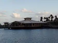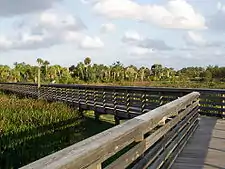 Green Cay Wetlands (or Green Cay Wetlands and Nature Center) is a nature preserve located in Boynton Beach, Florida. The 100-acre (0.40 km2) property was purchased in 1999 from Ted and Trudy Winsberg, who used the property for farming. The Winsbergs sold the property for 1/3 of its appraised value with the condition that it would be made into a wetland. Construction began in July 2003. It was created jointly by the Palm Beach County Utilities Department and the Palm Beach County Parks and Recreation Department in 2004. This park includes 1.5 miles (2.4 km) of an elevated wooden boardwalk, which takes visitors through various habitats, including cabbage palm hammock, cypress swamp, wetland hammock, and tropical hardwood hammock. The boardwalk also features a Seminole chickee hut as well as several gazebos, which have descriptive signs offering information on the wildlife and plant life.