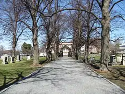 Greenlawn Cemetery is a historic cemetery at 195 Nahant Road in Nahant, Massachusetts. Development of the 5.7-acre (2.3 ha) cemetery was one of the first civic projects of the town of Nahant after its separation from adjacent Lynn in 1853. The cemetery was established in 1856 on two acres (0.81 ha) of land, and has been extended several times to its present size. Its dominant feature is the Ellingwood Chapel, a Gothic Revival structure built in 1920.[2] A 3.9-acre (1.6 ha) portion of the cemetery was listed on the National Register of Historic Places in 2000.[1]