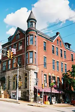 The Greensburg Downtown Historic District of Greensburg, Pennsylvania, is bounded approximately by Tunnel Street, Main Street, Third Street, and Harrison Avenue.[2] It consists of 62 buildings on 21.8 acres (8.8 ha), with the most notable buildings from the years 1872-1930. The district's oldest structure (1872) is the former Masonic Temple at 132 South Main Street. The Academy Hill Historic District is directly to the north of downtown Greensburg.