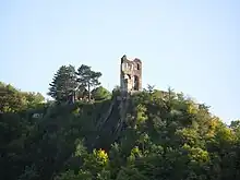 In 1680 it was conquered by Louis XIV of France and was extended, together with the fort of Mont Royal in the horshoe bend of the Mosel north of the town of Traben-Trarbach as a part of the fortifications. During the War of the Spanish Succession (1701–1714), in 1702 it was taken by the French under Tallard and in 1704 on the express orders of the commanding officer John Churchill, 1st Duke of Marlborough it was overpowered by Friedrich of Hesse-Kassel. The badly damaged castle was then occupied by the Dutch. In 1730 it was repaired by the Electorate of Trier for the defence of Koblenz and the Rhine river. In the War of the Polish Succession it was taken after three weeks' siege for the fourth and last time by the French who destroyed it in July 1734.[1] The castle was blown up, huge chunks of it have plunged into the valley beneath.