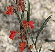 Grevillea bronweniae is an erect shrub that typically grows to a height of 1.0 to 1.8 metres (3.3 to 5.9 ft). The leaves are linear to narrowly elliptic with the narrower end towards the base, 10 to 160 millimetres (0.4 to 6.3 in) long and 2 to 14 millimetres (0.08 to 0.55 in) wide with the edges curved down or rolled under. The flowers are arranged in wheel-like clusters in leaf axils and at the ends of stems, on a rachis 0.5–2.0 mm (0.020–0.079 in) long, and are scarlet. The pistil is 8–12 mm (0.31–0.47 in) long and hairy. Flowering occurs from June to November and the fruit is a woolly-hairy, narrow oval follicle about 15 mm (0.59 in) long.[2][3][4]