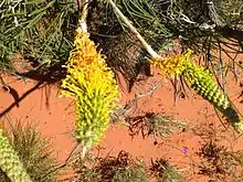 Grevillea eriostachya, also known as flame grevillea,[3] orange grevillea,[4] or honey grevillea,[5] is a species of flowering plant in the family Proteaceae and is endemic to western parts of Australia. It is a shrub with a leafy base, mostly linear leaves and conical groups of bright yellow flowers on long canes above the foliage.