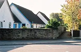 The Plough, opposite the station site, which acted as ticket office before the station was built. The footpath to the left, between two fences, follows the course of the dismantled line.