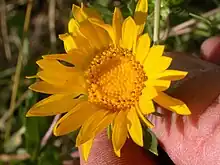 Grindelia nana is a species of flowering plant in the daisy family known by the common names Idaho gumplant and Idaho gumweed. It is native to western North America, especially the western United States, where it can be found in a number of dry habitats. This is a weedlike perennial herb growing mainly erect to heights between 20 centimeters and one meter. Its stems and foliage are mostly green with some reddish coloration. Leaves are up to 9 centimeters long. The tops of the stem branches bear flower heads one or two centimeters wide, which are bell-shaped with rounded bases. The head is a cup of green clawlike, curling or erect phyllaries.