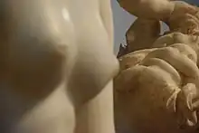 The statue combines the heroic nudity, represented by the goddess, and the contrasting wild, animalistic, Dionysian nudity that Pan embodies. It has been described as a "characteristic example of Hellenistic rococo."[4]
