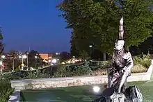A sculpture of Lieutenant Colonel John McCrae by Ruth Abernethy was erected in the foreground of Guelph Civic Museum in 2015. Lieutenant-Colonel John McCrae is shown, with his dress as an Artillery officer and his medical bag nearby, as he writes. The statue shows the destruction of the battlefield and, at his feet, the poppies which are a symbol of Remembrance of World War I and all armed conflict since.[11]