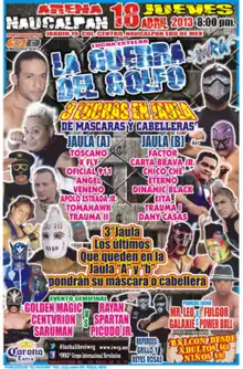 Guerra del Golfo (2013) (Spanish for "Gulf War") was a professional wrestling major event produced by Mexican professional wrestling promotion International Wrestling Revolution Group (IWRG), which took place on April 18, 2013, in Arena Naucalpan, Naucalpan, State of Mexico, Mexico. The annual Guerra del Golfo main event consists of three matches in total, with two "qualifying matches", multi-man steel cage matches where the last person left in the cage advances to the main event of the night. The two losers is forced to wrestle inside the steel cage, with the loser being forced to either take off their wrestling mask or have their hair shaved off under Lucha de Apuesta, or "Bet match" rules.