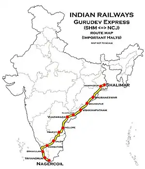 The 12659 / 60 runs from Nagercoil Junction via Thiruvananthapuram, Kottayam, Ernakulam Town, Palakkad Junction, Coimbatore Junction, Tirupati, Vijayawada Junction, Eluru, Visakhapatnam, Bhubaneswar, Kharagpur Junction to Shalimar.[5]