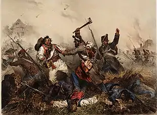 Klapka participated during 26–27 February in the Battle of Kápolna, commanding the right wing of the Hungarian army at Verpelét.[5] The battle was lost because of Dembiński's poor army leading and indecision. After Dembiński's order of retreat, at 1 March Klapka fought successful rearguard actions against the Austrian corps led by Ladislaus von Wrbna at Egerfarmos.[5]
