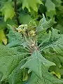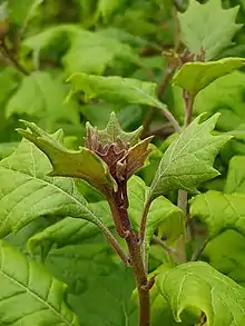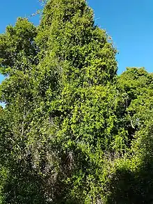 Gymnanthemum mespilifolium (Greek gymnos = naked and anthos = flower, alluding to the lack of paleae on the receptacle - mespilifolium = leaf like that of Mespilus), is a sprawling woody liane up to 15 cm thick from Southern Africa occurring in the Eastern Cape, KwaZulu-Natal, Limpopo, Mpumalanga, Western Cape.[1][2] This species is found as a vigorous pioneer in abused or degraded habitats such as cleared areas and forest margins. The genus comprises some 43 species found in sub-Saharan Africa, Madagascar, Southern Asia, and introduced into Brazil.[3]