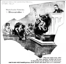 Mirtel murdered Bessarabo in Square La Bruyère, Paris, on 31 July 1920. On 4 August 1920 his corpse, shot dead by a revolver, was discovered at the bottom of a trunk in the Nancy rail station, having been sent by train from the Gare de l'Est. On 21 June 1922 Mirtel, defended by Vincent de Moro-Giafferi, was sentenced to twenty years of forced labor. During the investigation, suspicions weighed on the death of his first husband, who feared that his wife would poison him, and who committed suicide with a revolver in March 1914. But the investigation confirmed the suicide. His daughter, Paule, present at the scene of the crime and judged for complicity, was acquitted. Many dailies followed the trial, rich in theatrics: Le Petit Parisien (17 issues),[5][6] Le Temps (12 January 1922), Le Matin (22 June 1922), Le Figaro (29 April 1921), Le petit journal illustré (18 June 1922), L'Ouest-Éclair (June 9, 1922) and Le Gaulois (29 April 1921). Arthur Bernède recounted the lawsuit in the Bessarabo case (Tallandier, 1931).[7]