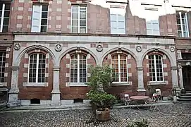 These Renaissance arcades featuring portrait medallions were commissioned by the merchant Jean de Nolet in 1542 and executed by the sculptor Nicolas Bachelier. Their framework, featuring a floral wreath (referred to as a 'triumphal garland' in the surviving documents), draws on Roman triumphs (laurel), as well as the arms of the sixteenth-century merchant: "On azure two palms or in saltire, surmounted by a wreath of roses proper on a fesse, ribboned argent and between three stars same, two borne in chief and one in point".[1]