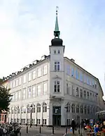 The large property at No. 4 on the other side of the square, at the corner of Læderstræde, is from 1796-1797 and was originally built as a new headquarters for Johan Frederik Schultz's printing business. It has 9 on the square and 20 bays on Læderstræde. The corner bay is topped by a small spire which was added in about 1900.[4] The building housed the Ministry of Environment from 1993 to 2014. It has now been converted into apartments and contains a Moss Copenhagen flagship store in the ground floor.[5] The five-bay house at No. 6 was built in 1804-06 by Niels Schønberg Kurtzhals for silk and textile merchant Lorentz Andreas Hinrichsen. The four-bay house at No. 8 was built for another silk and textile merchant, Nikolaj Abraham Kall. The building at the corner of Gammel Strand (No. 10) is the former headquarters of the insurance company Kgl. Brand. The building was originally designed by Fritz Koch but completed after his death by Gotfred Tvedein 1906æ It now houses the law firm Johan Schlüter .