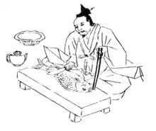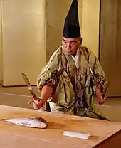 The filleting is done using only a knife (庖丁, hōchō)[lower-alpha 1] and a pair of metal chopsticks (真魚箸, manabashi), without touching the fish with one's hands. The chef is dressed in Heian period clothing, most notably an eboshi (烏帽子) hat and hitatare (直垂) robe. The hitatare features long sleeves and a drawstring, which is used to tie up the sleeves during the ceremony.