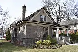 The H.A. Schmelzel House in Boise, Idaho, is a 1+12-story bungalow designed by Tourtellotte & Co. and constructed in 1906. It features Colonial Revival details, including flared eaves and an offset porch. First floor walls are veneered with random course sandstone, and front and side gables are covered with square shingles. Square shingles also cover the outer porch walls. The house is considered the first example of a bungalow in the architectural thematic group of John E. Tourtellotte. It was added to the National Register of Historic Places in 1982.[2]