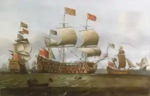 HMS Britannia was a 100-gun first rate ship of the line of the Royal Navy, built by Phineas Pett II at Chatham Dockyard, and launched on 27 June 1682.[3]