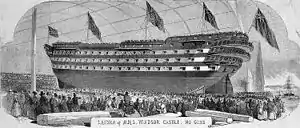 Under trials on 11 April 1853 she had made 10.15 knots under steam, and she proved a magnificent sailing ship, but the second-hand engines turned out distinctly unsatisfactory, and the hurried conversion had compromised her structural strength; she thus saw no active service after the Crimean War and paid off in 1856. She served as guard ship of sailing ordinary at Devonport from 1860 to 1863, then as a receiving ship at Portsmouth from 1863, where she became a familiar and much-photographed sight, always described on postcards as "the flagship of Sir Charles Napier". She replaced HMS Victory as flagship of the Port Admiral at Portsmouth in 1869 (with Victory becoming her tender), firing salutes to passing dignitaries, such as Queen Victoria on her way to Osborne House. On 4 February 1879, a fire broke out at the fore of the ship. It was extinguished with the assistance of two tugs.[2] She served as flagship for the Commander-in-Chief from 24 October 1884 to 1886 and for Victoria's birthday celebration and fleet review at Portsmouth in 1896 "dressed smartly for the occasion" (despite having been paid off on 31 March 1888).