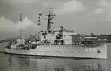 In August Soemba was laid up as she was considered unfit for further duty, but the Dutch requested that she be refitted as a radar training ship at the end of 1944 to train Dutch personnel on all the different types of British radars used by Dutch ships. Consequently, the ship's armament was removed, the bridge enclosed and she was equipped with a Type 281 long-range air warning radar on the foremast, a Type 271 surface search radar above her bridge, a Type 291 air warning radar, also on the foremast, a Type 277 height-finding radar in front of the bridge, a Type 268 submarine radar on a pole mast amidships and a Type 293 radar on the mainmast at Grangemouth between May 1945 and May 1946.[7]