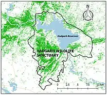 Hadgarh Wildlife Sanctuary map, green and blue colors show forest cover and waterbody, respectively.