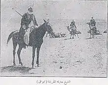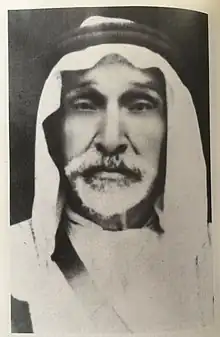 Haditha Ali Abdullah Al-Khraisha (Arabic: حديثه علي عبد الله حميدي خلف سالم حنيف محمد (سليم العود) محمد سليمان حنيف الخريشه; 1882–1952) was a Jordanian Bedouin tribal sheikh. He was one of the two paramount sheikhs of the Bani Sakhr Tribe,[1] arguably the most powerful tribe in Jordan.[2] Haditha headed the northern clans of the Bani Sakher (al-Ka'abnah),[3] while Mithgal Al-Fayez headed the other half, (al-Twaga). In the early twentieth century (1922 & 1924), Haditha and the Bani Sakhr, in addition to other Trans-Jordanian tribes such as the Huweitat and the Belqawiah, fought the Wahhabi Ikhwan, a religious militia who helped establish Abdul Aziz Ibn Saud as the first King of Saudi Arabia. The Wahhabi Ikhwan were Abdul Aziz Ibn Saud's tool for territorial expansion[4] and lent religious legitimacy to Ibn Saud's territorial and political ambitions. According to King Faisal Al Saud the armed resistance that Bani Sakhr put up against Ibn Saud and the Wahhabi Ikhwan was "the reason that Saudi Arabia's borders do not extend all the way to Palestine and why the Al Sauds never became the rulers of the Levant".[5] Haditha was known throughout Arabia for his wisdom and chivalry,[6] He played a significant role in building the nascent Jordanian state and shaping its development.[7] An ally and supporter of King Abdullah I,[8] Haditha served several terms as Senator and Parliamentarian, including the first Jordanian Senate in 1947 which consisted of only ten members.[9] Haditha was also elected to the second Legislative Council in June 1931,[10][11] and the Fourth Legislative Council in 1937[11][12] while Jordan was still an Emirate. Haditha was also one of the founding members of the Jordanian Solidarity Party (Hizb al-Tadamun al-Urduni) in March 1933.[13] Sheikh Haditha also cultivated the oasis of Azraq, Jordan.[14][15]