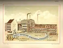 Hagen & Sievertsen was founded in 1961. It was ibnitially based in rented premises on Vestergade in central Odense in 1851. It specialized in lithographic printing on pharmaceutical packaging. The firm grew steadily and in 1867 relocated to larger premises on Nedergade. These premises expanded with a new factory in 1888. One of the buildings was a four-storey building featuring an elevator. The firm had by then also moved into the markets for printing of books and illustrations.[1] The company was a major supplier of prescription envelopes to Danish pharmacies.[2]