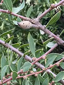 Hakea 'Burrendong Beauty' is a hybrid between H. myrtoides and H. petiolaris and was discovered in the Burrendong Arboretum.[1]
