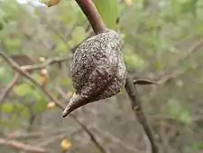 Hakea ferruginea is an erect, rounded, non-lignotuberous shrub which typically grows to a height of 1 to 4.5 metres (3 to 15 ft). The branchlets are hairy and the leaves are arranged alternately.[3] The pale green leaf blade is flat, narrowly to broadly egg-shaped or elliptic and is 1.5 to 8.5 centimetres (0.6 to 3.3 in) in length and 1.2 to 2.7 cm (0.47 to 1.06 in) wide.[4] It blooms from July to November and produces white-cream flowers.[3] The solitary inflorescences contain 16 to 20 flowers with a cream-white perianth. After flowering obliquely ovate shaped beaked fruit that are 2 to 3.1 cm (0.79 to 1.22 in) in length and 1.1 to 1.8 cm (0.43 to 0.71 in). The black to brown seeds within have a narrowly ovate or elliptic shape with a wing down one edge.[4]
