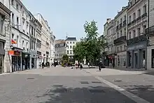 Over the course of the late 14th and early 15th centuries, a new market building was erected on the same site, funded by the Duke of Berry.[6] This second iteration became known as the halles and measured 156 metres in length by 24 metres in width.[4] Its floorplan comprised three rows of pillars—each approximately three metres high—forming two wide aisles;[6] the general outline of these can still be seen in the paving stones on the present-day street.[7] The rebuilt market was successful and in 1412 the Duke of Berry transferred the rights to all the custom and trade of the Sèvre and Vendée rivers from Fontenay-le-Comte to Niort. Parts of the market were also reserved for foreign traders, in order to encourage international business.[8] Local historian Hilaire-Alexandre Briquet, in his Histoire de la ville de Niort, described Niort's market hall as the largest and most convenient in France at that time.[6] The building remained in this location for the next three centuries, but was dismantled in 1793 in order to make way for increased traffic through the town. The thoroughfare created by the removal of the market hall was originally called Rue de l'Unité, was renamed Rue des Halles in 1825 and finally became Rue Victor Hugo in 1885.[4]