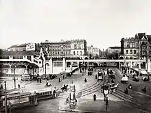 Since the beginning of the 18th century, several cemeteries have been built outside the former city in front of the Hallesches Tor. The area was named Am Halleschen Thore around 1848. In the years 1876 to 1879, Heinrich Strack erected arcaded residential and commercial buildings and the Belle-Alliance-Brücke as a representative entrance to the city centre of Berlin instead of the gate. The complex was decorated with four groups of figures depicting trade and traffic. After severe war damage and post-war demolition, the bridge was restored in the 1950s and 1980s and two groups of figures were reassembled.