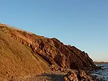 Resistant rock strata exposed on the wave-cut platform below Black Cliff, looking north.