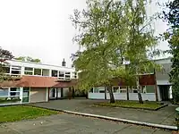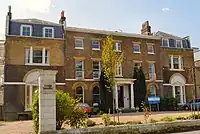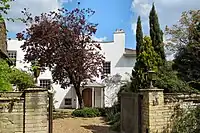 ![]() | South Lodge, Ham Common | 1856-1862 | II | From 1838 to 1848 Alcott House was home of a utopian spiritual community and progressive school founded by James Pierrepont Greaves. The term "New Age" originates from one of their publications. Supporters of Alcott House, or the Concordium, were a key group involved in the formation of the Vegetarian Society in 1847.[39] In 1849 following an outbreak of cholera it was bought by John Minter Morgan as the National Orphan Home for Girls. The present building, 'South Lodge', dates from 1856-1862. The orphanage closed in 1924.[40] After the Second World War it was converted into flats.[41] |