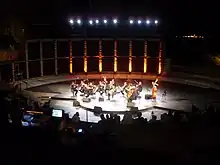 The Hammamet International Festival (French: Festival international d'Hammamet) (Arabic: مهرجان الحمامات الدولي) is an annual festival of music and art in the coastal city of Hammamet in Tunisia. It was established in 1964 and is held in July and August in the amphitheatre[1] of 1000 seats overlooking the Gulf of Hammamet. It is organized by the Ministry of Culture , which manages and appoints the director. Since 2014, the Centre and the festival have been under the direction of Kamel Ferjani.[2] In the 1980s, Ute Lemper, Mikis Theodorakis, Miriam Makeba made appearances, and more recently, Victoria Abril, Emir Kusturica, Tina Arena, Anouar Brahem, Raouf Ben Yaghlane, Leila Hjaiej and French rap group IAM4 have appeared.