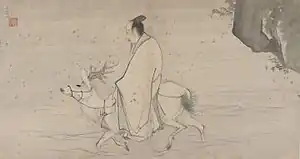 Han Zhong (韓終 or 韓眾) was a Qin dynasty (221 BCE-206 BCE) herbalist fangshi ("Method Master") and Daoist xian ("Transcendent; 'Immortal'"). In Chinese history, Qin Shi Huang, the first emperor of China, commissioned Han in 215 BCE to lead a maritime expedition in search of the elixir of life, yet he never returned, which subsequently led to the infamous burning of books and burying of scholars. In Daoist tradition, after Han Zhong consumed the psychoactive drug changpu (菖蒲, "Acorus calamus, sweet flag") for thirteen years, he grew thick body hair that protected him from cold, acquired a photographic memory, and achieved transcendence. He is iconographically represented as riding a white deer and having pendulous ears.