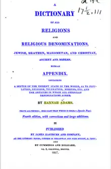 This article incorporates text from this source, which is in the public domain: Adams, Hannah (1817). A Dictionary of All Religions and Religious Denominations, Jewish, Heathen, Mahometan and Christian, Ancient and Modern: With an Appendix, Containing a Sketch of the Present State of the World, as to Population, Religion, Toleration, Missions, Etc., and the Articles in which All Christian Denomination Agree (Public domain ed.). James Eastburn, at the Literary rooms, corner of Broadway and Pine street, N. York.