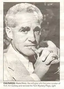 In early 1944 he was appointed Assistant Keeper of Art under the director Trevor Thomas (19071993) to Leicester Museum and Art Gallery just before the opening of an exhibition, which ran from 527 February 1944, titled 'Mid-European Art', which was supported by the Free German League of Culture.[3][4] Hess was promoted to Keeper of Art following Thomas' sudden and forced departure in 1946. Later, he was appointed curator at York Art Gallery in 1948, when the gallery reopened after being bombed during the Second World War. He lived with his wife (and fellow German refugee) Lillie Williams and their daughter Anita at 56 Skeldergate in York.[2]