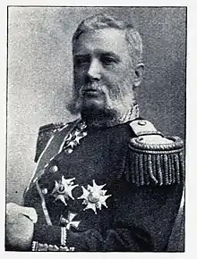 He attended the Norwegian Military Academy until 1856 and from April to September 1857. He had reached the rank of premier lieutenant in 1857, and attended the Norwegian Military College before he was a brigade aide-de-camp in Bergen and from 1864 an apprentice in the General Staff. He was the leader of the Norwegian Military Academy from 1872 to 1885, and also lectured in topography and wrote the textbook Veiledning i Terrænget. He served in different places before and after his stint at the academy. He reached the ranks of captain in March 1867, major in July 1885, lieutenant colonel in January 1889, colonel in February 1891, and major general in April 1894, lastly Lieutenant General from July 1899.[1] He became Chief of the General Staff in 1894, and from 1897 to his retirement in 1903 he served as the Commanding General of Norway.[3] He was decorated with the Grand Cross of the Royal Norwegian Order of St. Olav in September 1903.[1]