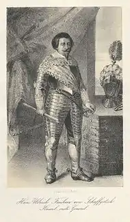 Hans Ulrich von Schaffgotsch (28 August 1595 – 24 July 1635) was a Silesian nobleman and Generalfeldwachtmeister who fought in the Silesian front of the Thirty Years' War. He was falsely convicted of treason and executed following a purge within the army of the Holy Roman Empire that targeted officers associated with former Generalissimo Albrecht von Wallenstein.