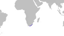 The distribution of the Natal shyshark is restricted to the waters off the KwaZulu-Natal, and possibly also the Western Cape and Eastern Cape Provinces of South Africa. Its total range is estimated to encompass an area of under 100 km2 (39 sq mi).[1] A benthic species, it can be found in the surf zone and on shallow rocky reefs.[2] As opposed to the puffadder shyshark, which inhabits deeper, cooler waters in the northeastern parts of its range, in those areas the Natal shyshark occurs in warm inshore waters at a depth of 0–30 m (0–98 ft).[4]