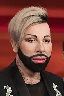 Harald Glööckler, real name Harald Glöckler[1] (born 30 May 1965[2] in Maulbronn), is a German fashion designer and entrepreneur, who became famous mainly for his rhinestone-studded and glittering creations.[3] Glööckler's trademark is a crown motif, which is often supplemented by a "POMPÖÖS" lettering.