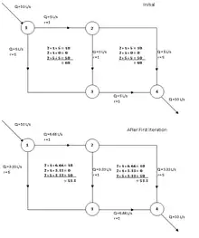 The Hardy Cross method is an application of continuity of flow and continuity of potential to iteratively solve for flows in a pipe network.[1] In the case of pipe flow, conservation of flow means that the flow in is equal to the flow out at each junction in the pipe. Conservation of potential means that the total directional head loss along any loop in the system is zero (assuming that a head loss counted against the flow is actually a head gain).