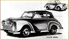 The original price of the car had been promoted at less than £300;[23] however, by the time the company was formed and before production had commenced it had already risen to an estimated £430.[24] In January 1950 it was revealed that the car would cost less than £500 inclusive of sales tax.[25] By March 1951 no cars had been delivered and the company revealed that the expected pricing was now £549 plus sales tax" meaning that the total purchase price would be less than £600.[26] The first aluminium bodied Pacific Convertible vehicles sold in April 1952 cost £695 including sales tax.