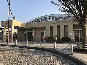 The station consists of two side platforms serving two tracks. The station shares a building with a community facility named "Harmony Hall Harumachi". There is a small waiting area and a staffed ticket window. Access to the opposite side platform is by means of a covered footbridge.[2][3][4]