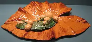 Its output was mostly functional and based upon plants found in Hawaii.[1] The guild also produced purely decorative pieces, such as the platter in shape of taro leaf with guava branch (illustrated), which was made for the luxury retailer S. & G. Gump and Company.[2]