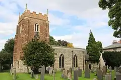 The Church of St Mary and All Saints, Hawksworth, listed Grade II*, is Norman in origin, with an elaborate tympanum, but was almost completely rebuilt in the 19th century. The church contains a large portion of an Anglo-Saxon Cross, which is believed to date back to the late 9th or early 10th century.[16][17] The Norman tympanum, believed to date to the 12th century, is made of sandstone and is surrounded by a semicircular ornamental stone arch.[18] The tympanum marks the founding of the church in Hawksworth, with the (translated) Latin inscription reading "Walter and his wife Cecelina caused this church to be made in honour of Our Lord and of Saint Mary the Virgin and of all God's Saints likewise".[18] The rebuilding of the church took place in 1812–1813 (nave), 1837 (north aisle) and 1851 (chancel). In 1866 the west porch was demolished and the tympanum, which had been positioned above the porch entrance, was moved to its present position on the south exterior face of the tower.[18] The brick tower dates from the 17th century.[19]